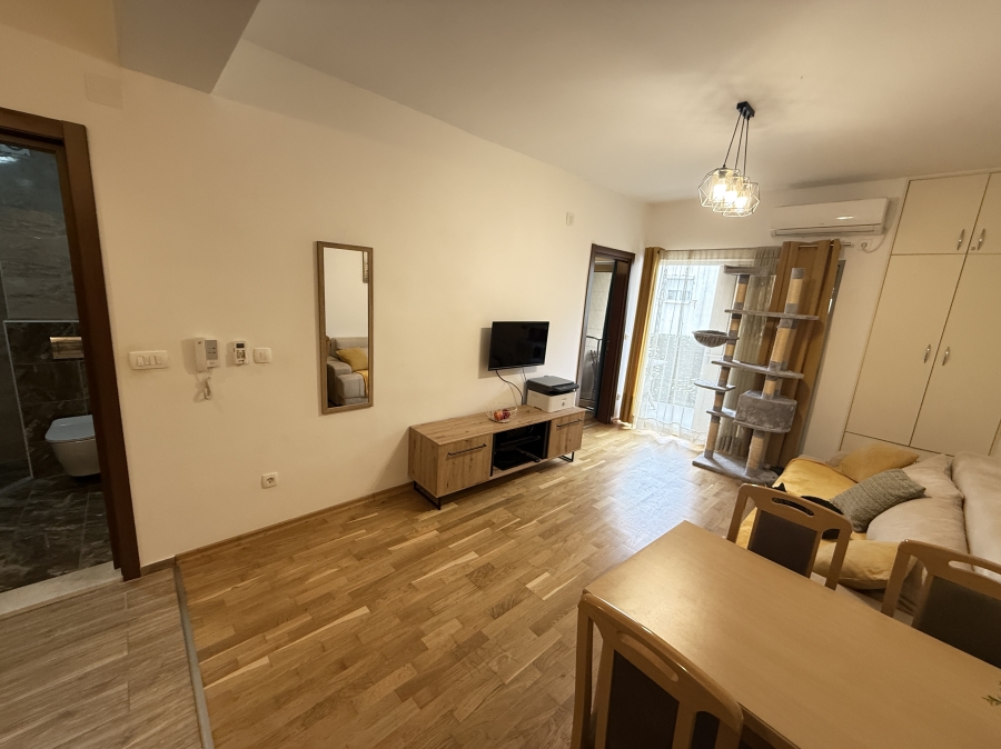Prodaje se potpuno namjesten jednosoban stan smjesten u novijoj zgradi iza Eko pumpe na glavnom bulevaru u Budvi.